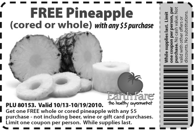 Earth Fare is offering a FREE Pineapple with $5 Purchase Printable Coupon valid throgh 10/19. … [Read more...] about Earth Fare: FREE Pineapple w/ $5 Purchase Printable Coupon