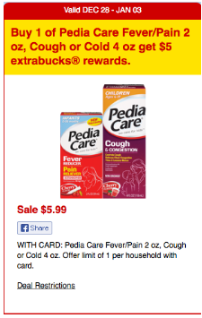 Reminder: Starting on Sunday 12/28, CVS will have the Pedia Care Fever/Pain 2 oz, Cough or Cold 4 oz on sale for $5.99 and when you buy 1 you will get a $5 Extra Care Buck (limit 1). There is a $1/1 PediaCare product Printable Coupon available to print making this FREE + $0.01 moneymaker after stacked offers!