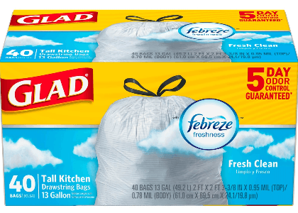 - $2.50 on any ONE (1) Glad Large Trash Bags, 34 ct or higher