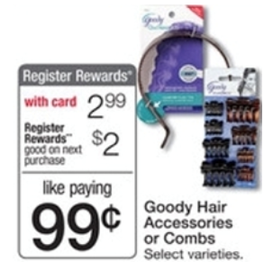 Starting on Sunday, 12/21 Walgreens will have Goody Hair Accessories or Combs on sale for $2.99 and when you buy 1 you will get a $2.00 Register Reward. You can get either of these for just $0.99 after the Register Reward!