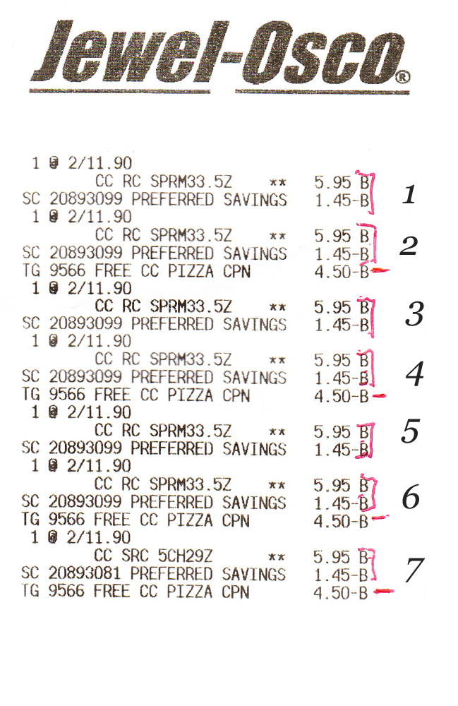 The Instant savings of $4.50 is being deducted in multiples of (2) so for every (2) you buy $4.50 will be deducted. At some stores when you purchase the 7th pizza it will deduct $4.50 so the 7th is FREE. (This Needs to be done in single transaction).