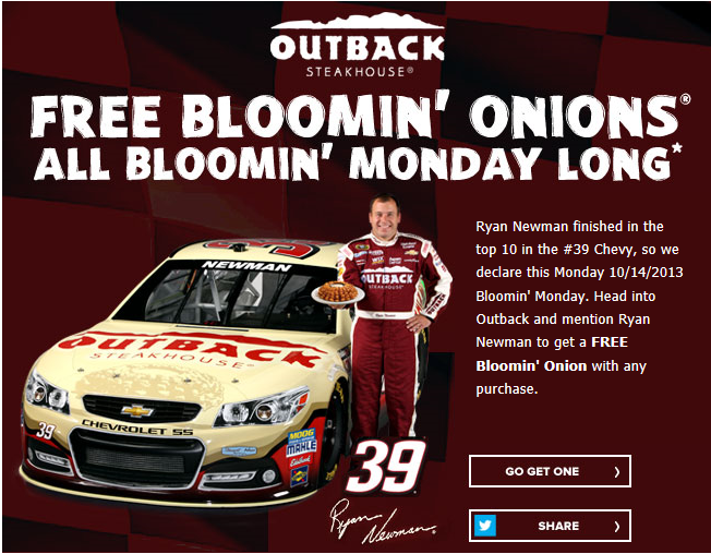 On Monday, October 14th, when you visit Outback Steakhouse and mention Ryan Newman to your server you will receive a FREE Bloomin’ Onion with any purchase.
