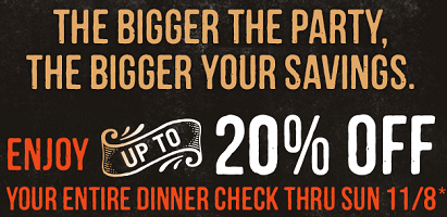 Outback Steakhouse is offering 10% OFF ENTIRE CHECK WITH PURCHASE OF TWO DINNER ENTRÉES OR 15% OFF ENTIRE CHECK WITH PURCHASE OF THREE DINNER ENTRÉES OR 20% OFF ENTIRE CHECK WITH PURCHASE OF FOUR OR MORE DINNER ENTRÉES THROUGH 11/8/2015. 10% OFF 2 DINNER ENTRÉES - OR - 15% OFF 3 DINNER ENTRÉES - OR - 20% OFF 4+ DINNER ENTRÉES … [Read more...] about Outback Steakhouse Coupon: Up to 20% off Dinner Entrees Purchase