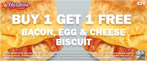Hardee’s is offering a Buy One Get One FREE Bacon, Egg & Cheese Biscuit Coupon! This offer expires 10/11/15. … [Read more...] about BOGO FREE Bacon, Egg & Cheese Biscuit at Hardee’s