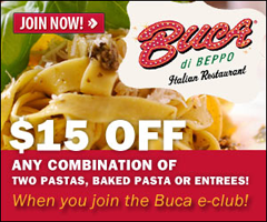 Sign up for the Buca eClub and receive special offers, coupons and a $15 Off coupon with purchase of any combination of two pastas or entrees. Currently not available at all locations. Enter your zip code to see if the offer is available in your area. … [Read more...] about Buca di Beppo: $15 off 2 Purchase Coupon