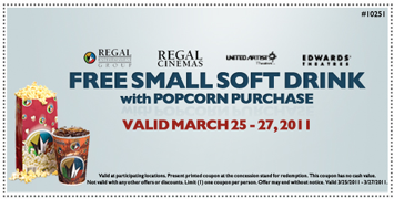 Regal Cinemas is offering a FREE Small Soft Drink with Popcorn Purchase Printable Coupon March 25 to March 27 … [Read more...] about Regal Cinemas: FREE Soft Drink w/ Popcorn Purchase Coupon 3/25 – 3/27