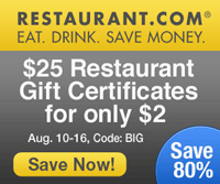Now save 80% Off Restaurant.com $25 Gift Cert. Get a $25 Restaurant.com Gift Certificates for $2.00 Use code: BIG *Expires 8/16/10 … [Read more...] about $25 Restaurant.com Gift Certificates for $2.00 (Exp. 8/16)