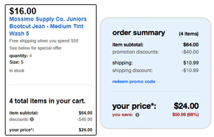 Target has Juniors Mossimo Supply Co. Bootcut Jeans on sale for $16. They are offering Buy 1 Pair of Mossimo Juniors Jeans and Get $10 off 1 Additional Apparel. Right now it is taking $10 off 1 pair of jeans making them $6. If you order 4 pair you can qualify for FREE Shipping. This makes 4 pair for $24 Shipped